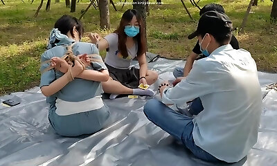 Wild chicks found a tied up stud in the woods and licked every inch of his dick