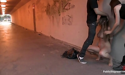 Two impossibly hungry brutal studs fuck one huge-chested dumpy platinum-blonde outdoors