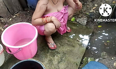 Indian building wife bathing outside